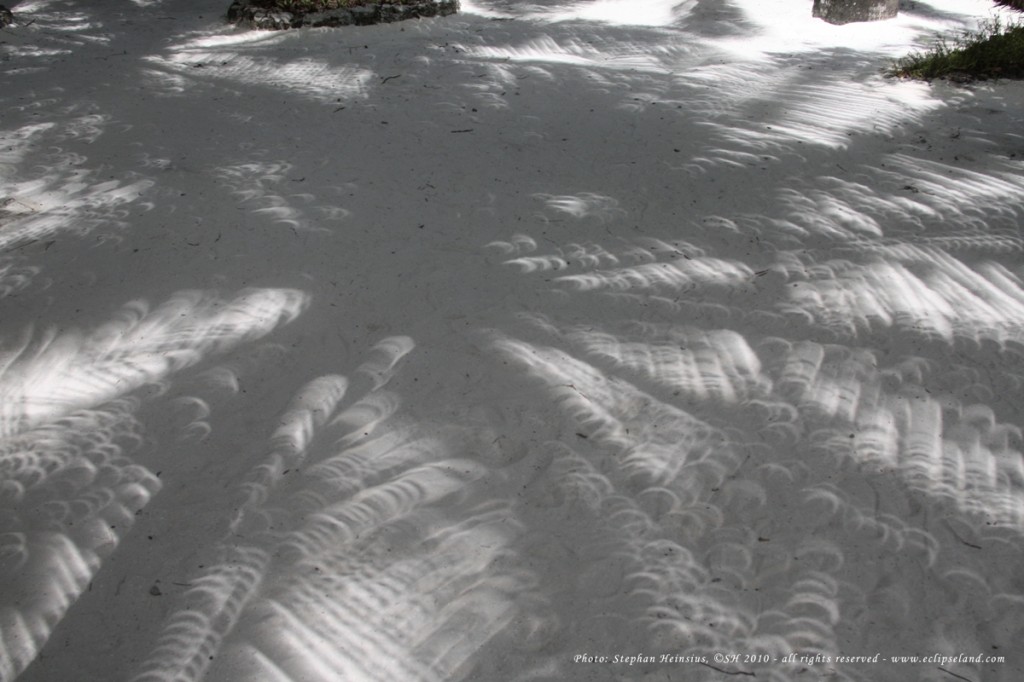 Rayos de sol con forma de medialuna parecen motas en el suelo, debajo de una palmera, durante un eclipse anular que tuvo lugar en enero de 2010. La imagen fue tomada por Stephan Heinsius, en la isla Ellaidhoo, Maldivas, en el Océano Índico